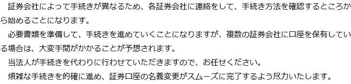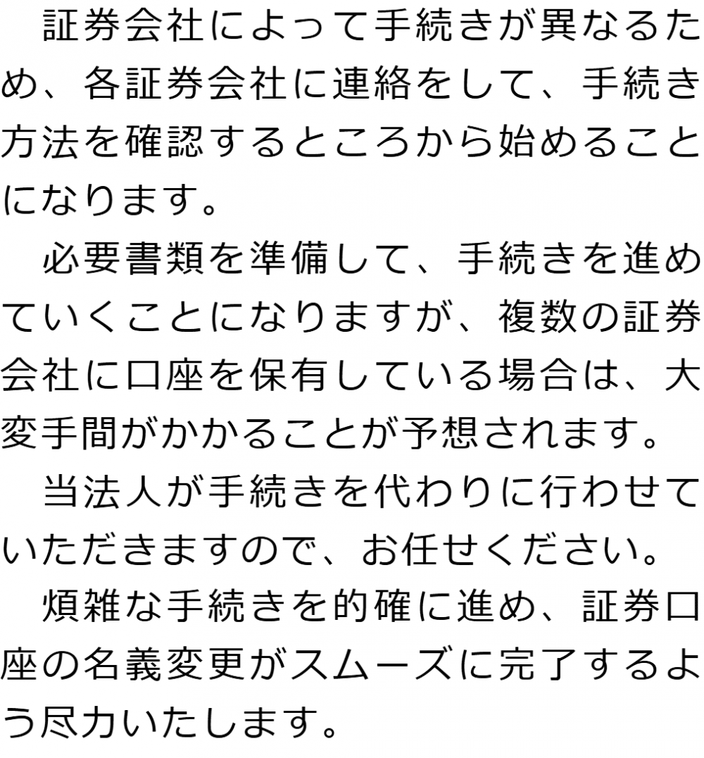 トップ業務内容証券口座の解約・名義変更 階層構造▼ 業務内容(目次) 証券口座の解約・名義変更 業務内容(目次)業務内容トップ行政書士法人心の業務内容遺言遺産整理相続人調査相続財産調査遺産分割協議書の作成預金・貯金の解約・名義変更証券口座の解約・名義変更自動車の名義変更心グループのその他の業務内容家族信託・民事信託節税対策事業承継遺言の検認相続放棄限定承認遺産分割遺留分侵害額請求相続登記相続税申告相続税調査 受付時間 平日 9時~21時、土日祝 9時~18時 夜間・土日祝の相談も対応します (要予約) 所在地 〒305-0032 茨城県つくば市竹園1-6-1つくばビルディング5F 0120-2403-39 お問合せ・アクセス・地図