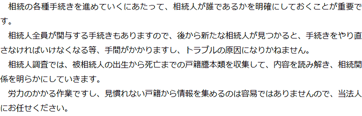 トップ業務内容相続人調査 階層構造▼ 業務内容(目次) 相続人調査 業務内容(目次)業務内容トップ行政書士法人心の業務内容遺言遺産整理相続人調査相続財産調査遺産分割協議書の作成預金・貯金の解約・名義変更証券口座の解約・名義変更自動車の名義変更心グループのその他の業務内容家族信託・民事信託節税対策事業承継遺言の検認相続放棄限定承認遺産分割遺留分侵害額請求相続登記相続税申告相続税調査 受付時間 平日 9時~21時、土日祝 9時~18時 夜間・土日祝の相談も対応します (要予約) 所在地 〒305-0032 茨城県つくば市竹園1-6-1つくばビルディング5F 0120-2403-39 お問合せ・アクセス・地図