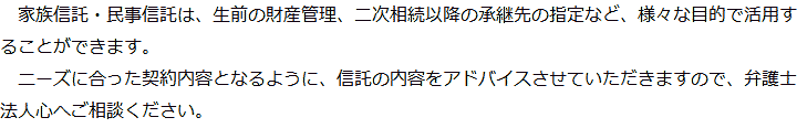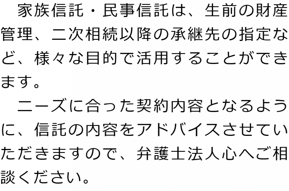 トップ業務内容家族信託・民事信託 階層構造▼ 業務内容(目次) 家族信託・民事信託 業務内容(目次)業務内容トップ行政書士法人心の業務内容遺言遺産整理相続人調査相続財産調査遺産分割協議書の作成預金・貯金の解約・名義変更証券口座の解約・名義変更自動車の名義変更心グループのその他の業務内容家族信託・民事信託節税対策事業承継遺言の検認相続放棄限定承認遺産分割遺留分侵害額請求相続登記相続税申告相続税調査 受付時間 平日 9時~21時、土日祝 9時~18時 夜間・土日祝の相談も対応します (要予約) 所在地 〒305-0032 茨城県つくば市竹園1-6-1つくばビルディング5F 0120-2403-39 お問合せ・アクセス・地図