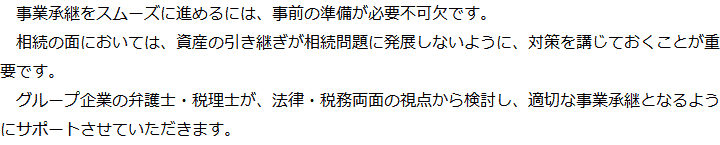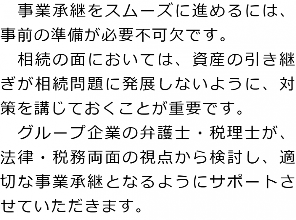 トップ業務内容事業承継 階層構造▼ 業務内容(目次) 事業承継 業務内容(目次)業務内容トップ行政書士法人心の業務内容遺言遺産整理相続人調査相続財産調査遺産分割協議書の作成預金・貯金の解約・名義変更証券口座の解約・名義変更自動車の名義変更心グループのその他の業務内容家族信託・民事信託節税対策事業承継遺言の検認相続放棄限定承認遺産分割遺留分侵害額請求相続登記相続税申告相続税調査 受付時間 平日 9時~21時、土日祝 9時~18時 夜間・土日祝の相談も対応します (要予約) 所在地 〒305-0032 茨城県つくば市竹園1-6-1つくばビルディング5F 0120-2403-39 お問合せ・アクセス・地図